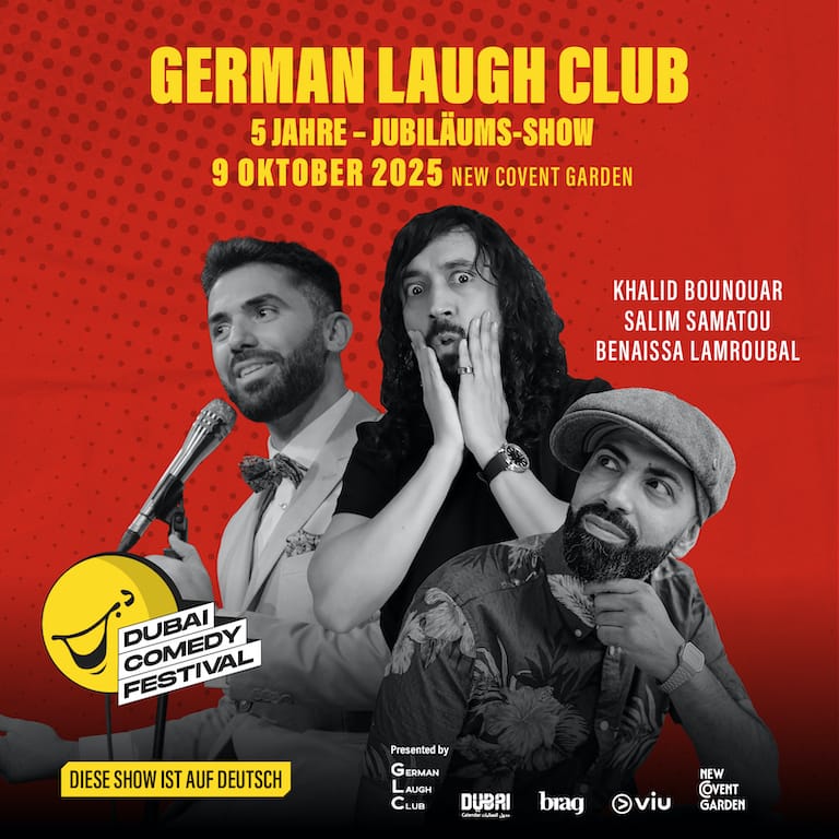 – The German Laugh Club is Dubai’s first and most successful stand-up comedy show in German – and has been completely sold out for five years. What began as a bold idea has developed into a permanent highlight in the city’s international cultural calendar. For their 5th anniversary, they’re officially becoming part of the Dubai Comedy Festival – and couldn’t imagine a better anniversary lineup than this: The Rebel Comedy Crew live in Dubai, with Salim Samatou, Khalid Bounouar, and Benaissa Lamroubal on stage. Thousands of guests have already laughed with us – at exclusive evenings that bring the German vibe to the desert. Whether expats, vacationers, or international fans of German-language comedy – they all celebrate the unique blend of entertainment, attitude, and authentic humor. Germany’s biggest comedians have already performed on our stage: From Felix Lobrecht and Luke Mockridge to the entire RebellComedy crew – including Salim Samatou, Khalid Bounouar, and Benaissa Lamroubal, who have long since enjoyed cult status in their own right. German stand-up comedy at its finest – right in the heart of Dubai. This show is presented by German Laugh Club. German Laugh Club 5-Year Anniversary Live at Dubai Comedy Festival at Ground level Entrance, no 1 Sheikh Zayed Rd, near ADCB Branch, Al Barsha, Al Barsha 1, Dubai, United Arab Emirates events Dubai Comedy Festival The New Covent Garden Theatre, Mall of the Emirates Salim Samatou