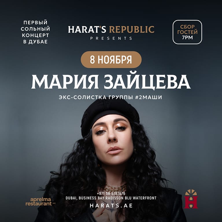 – Мария Зайцева с первым сольным концертом в Дубае! 8 ноября на сцене Harat’s Republic, состоится первый сольный концерт Марии Зайцевой в Дубае — яркой звезды российской эстрады и экс-солистки популярного дуэта #2Маши. Мария Зайцева — участница проекта «Голос», участница шоу «Точь в Точь» и победительница проекта «Один в один», покорившая миллионы своим уникальным голосом и харизмой. Её творчество — это сочетание глубоких эмоций, энергии и жизненной искренности. Она — автор и исполнительница хитов, знакомых каждому: «Босая», «Мама, я танцую!» и многих других. Этот концерт станет особенным событием для всех поклонников творчества певицы и ценителей живой музыки. Вас ждёт насыщенный вечер, полное погружение в атмосферу искренности и мощной энергетики, которой Мария делится с каждым зрителем. Maria Zaitseva / Мария Зайцева Live at Harat’s Republic, Dubai at 57P9+H4 Dubai, United Arab Emirates events Concerts Harat’s Republic Maria Zaitseva / Мария Зайцева