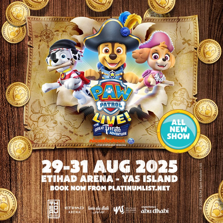 Paw Patrol Live! The Great Pirate Adventure at Etihad Arena Abu Dhabi For the very first time in the region, don’t miss the all-new PAW Patrol Live! “The Great Pirate Adventure”—a thrilling stage show packed with heroic pups and pirate fun!   Guests will see Ryder and his team of pups embark on a pirate-themed adventure to uncover hidden treasure. In Paw Patrol Live! “The Great Pirate Adventure,” Mayor Goodway is getting everything shipshape for a big Pirate Day celebration in Adventure Bay.  When Cap’n Turbot falls into a dark and mysterious cavern, it’s Paw Patrol to the rescue! Using their heroic rescue skills, problem-solving, and teamwork, the pups set sail to save the day. No job is too big, and no pirate pup is too small! Paw Patrol Live! The Great Pirate Adventure at Etihad Arena Abu Dhabi at Yas Dr, Yas Island, Abu Dhabi, United Arab Emirates events Kids Events Etihad Arena