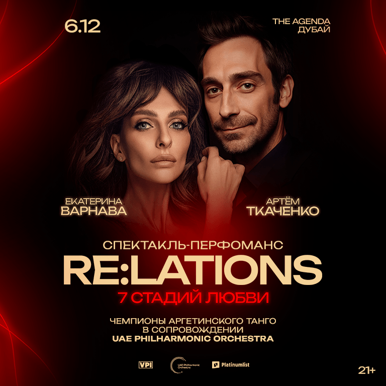 RE:LATIONS at The Agenda, Dubai Спектакль-перформанс RE:LATIONS. 7 стадий любви Gala Dinner Show с Екатериной Варнавой и Артёмом Ткаченко 6 декабря 2025, The Agenda, Дубай Проект, покоривший зрителей в Европе, впервые выходит на сцену Дубая. «RE:LATIONS. 7 стадий любви» — это театрально-музыкальное действо, соединяющее драматическое искусство, страсть аргентинского танго и звучание живого оркестра в формате Gala Dinner Show. В главных ролях — актёры театра и кино Екатерина Варнава и Артём Ткаченко. Вместе они проведут зрителей через семь эмоциональных стадий любви — от первого притяжения до зрелой близости. Это история будет рассказанна языком любви, страсти, тела и музыки. Каждый узнает себя! Действие сопровождает UAE Philharmonic Orchestra под управлением дирижера, лауреата премии «Золотая маска» Андрея Лебедева. Музыкальная программа включает оркестровые версии как современных композиций, так и произведений классики. Танцевальное пространство оживят чемпионы аргентинского танго Сагдиана Хамзина и Кирилл Паршаков вместе с труппой танцоров, превращающих каждую сцену в чувственный и зрелищный перформанс. Формат вечера — Gala Dinner Show: гости располагаются за столиками, наслаждаются изысканными закусками, алкогольными и безалкогольными напитками, погружаясь в атмосферу спектакля в максимально комфортной обстановке. Это синтез искусства и гастрономии, где каждый гость становится частью события. Заказ напитков и закусок осуществляется по меню за столиками до начала шоу. Стоимость заказа оплачивается дополнительно, напитки и закуски не входят в стоимость билета. Гостям доступна возможность сделать заказ до 21:00, обслуживание осуществляется официантами. RELATIONS с Екатериной Варнавой и Артёмом Ткаченко at The Agenda Venues FZC LLC, Al Jaddi St, Dubai, United Arab Emirates events Dining Experiences The Agenda