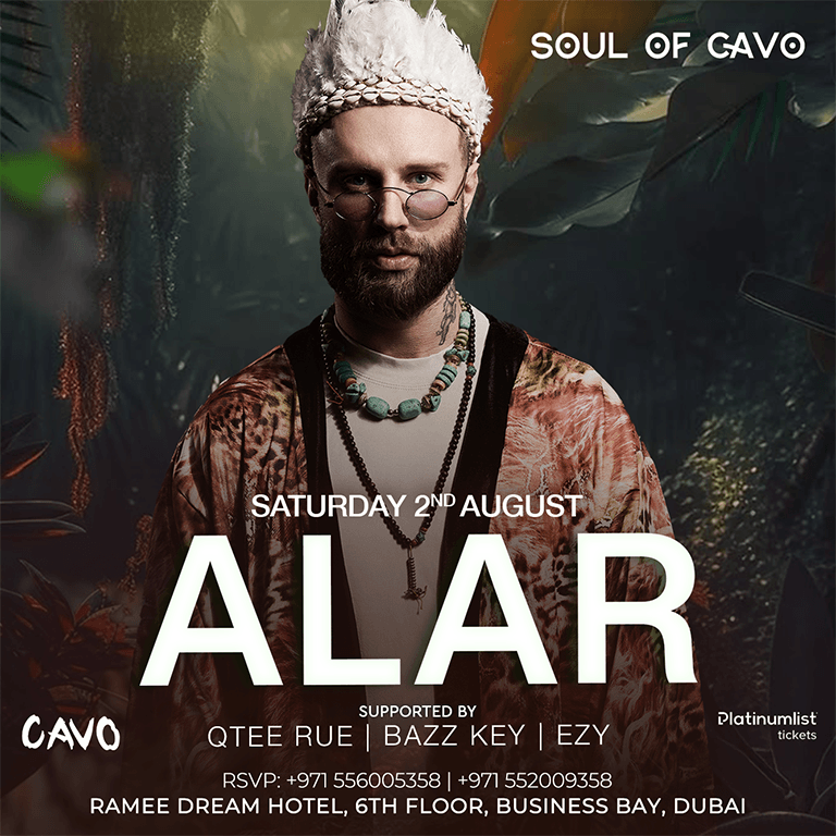 – Schedule The doors open at 10:00 pm and captivating the audience until 04:00 am  How to get there: By car: Drive on Sheikh Zayed Road, take Exit 29 to Al Marsa Street, then Follow Al Falea Street and Al Khayay Street to reach Cavo.  By public transportation: Take the Red Line Metro and exit at Business Bay Metro Station. From there, you can walk or take a short taxi ride to reach the club.  By taxi: You can also take a taxi to Cavo Club from anywhere in Dubai. It’s a famous destination and most drivers would be familiar with its location. Join us on Saturday, 2nd August at the iconic Cavo, Ramee Dream Hotel, for an unforgettable night with the globally acclaimed DJ and producer Alar – bringing his deep, hypnotic, and melodic beats to the heart of Business Bay! Experience the true Soul of Cavo as we transform the night with immersive jungle vibes, high energy, and an electric atmosphere. Soul of Cavo Presents Alar Live in Dubai at Cavo Restaurant, Dubai, United Arab Emirates events Nightlife Cavo ALAR